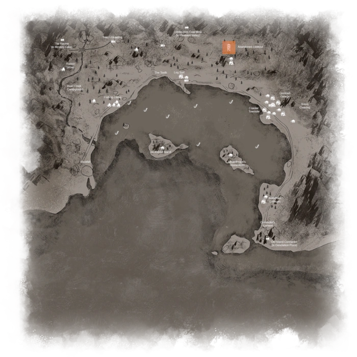 La torre de vigilancia abandonada es una torre que se encuentra en una colina en el extremo noroeste del Pueblo litoral y al noreste de la zona de troncos. El Torre de vigilancia abandonada está situado muy cerca de la zona de transición de la Mina de carbón del incendio camino al Valle apacible. Esto lo convierte en una parada para casi todos los que se dirigen al Valle apacible. El mirador está mucho más escasamente decorado en comparación con la Torre de vigilancia forestal de lago misterioso.