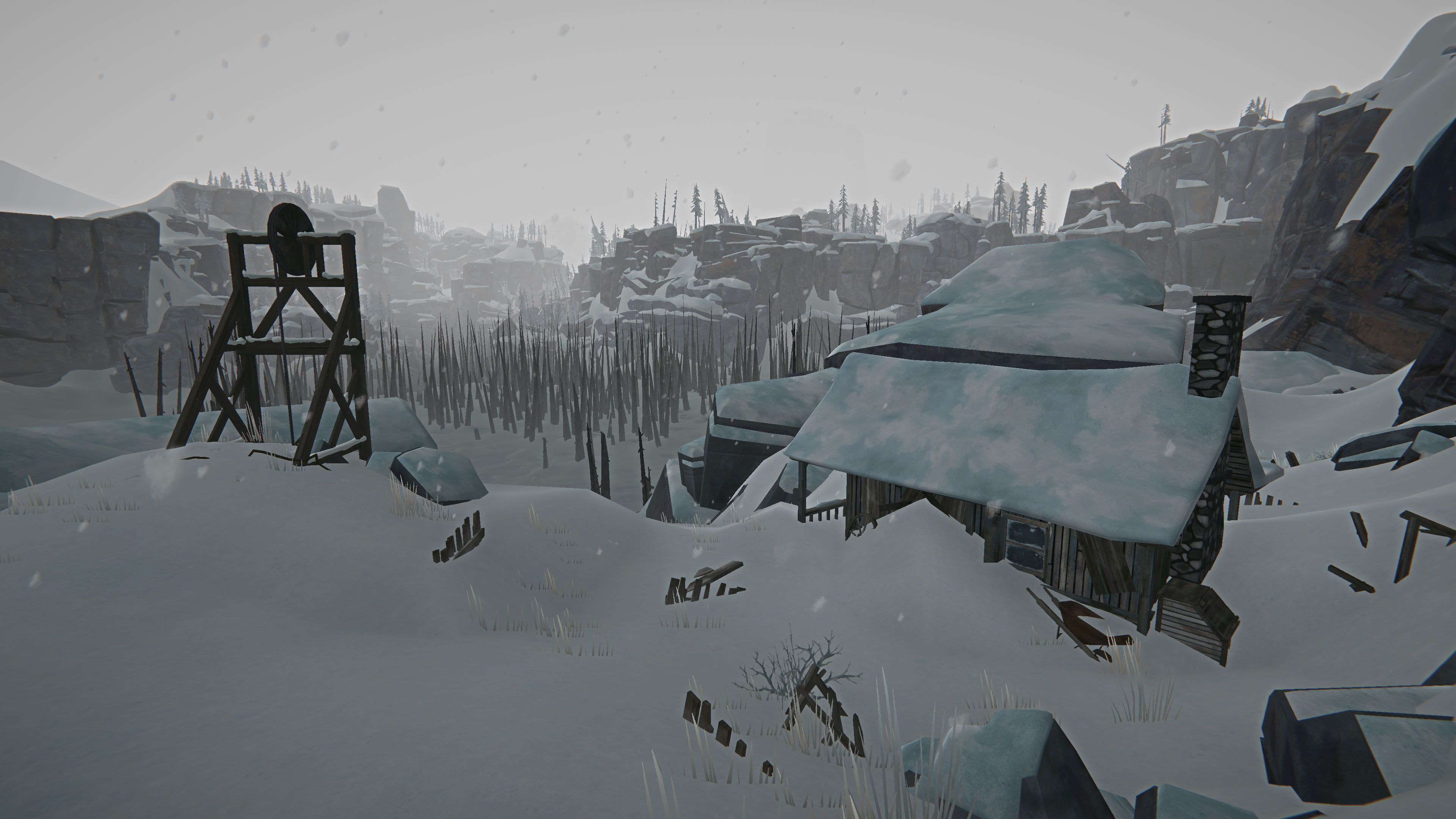 Внутри дома есть камин, кровать, сундук, чемодан, тумбочка с одним ящиком, полочка для ружья, а снаружи ящик для угля и рюкзак. Рядом есть домик для рыбалки, однако весь улов придется поднимать по альпинистскому тросу, поэтому в данной местности рыбалка - сомнительный способ добычи пропитания.