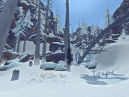 У завала камней по которой стекает река, стоит высокое полое дерево, внутри которого можно обнаружить немного припасов, например: еда, дрова и возможно тайник. У дерева растет гриб Рейши, шиповник, старый висящий мох.